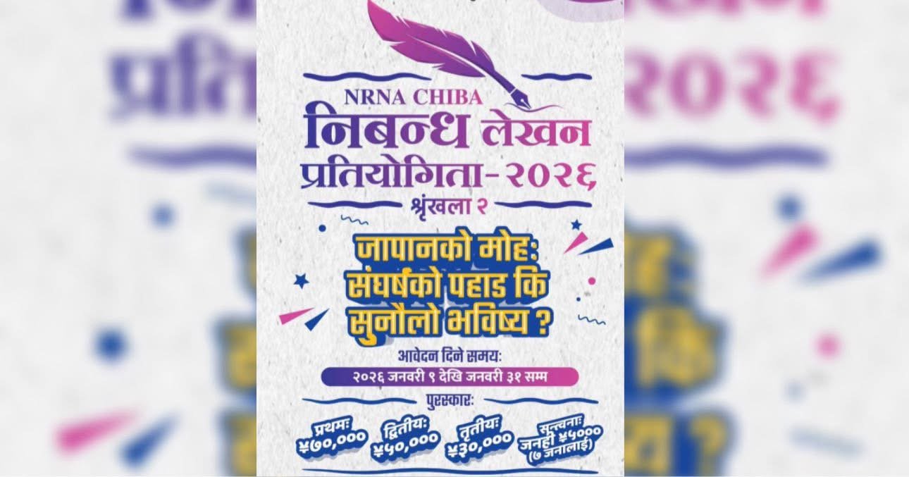 टोकियो। गैरआवासीय नेपाली संघ (NRNA) चिबा क्षेत्रीय समन्वय परिषद्ले ‘NRNA चिबा निबन्ध लेखन प्रतियोगिता–२०२६ (शृङ्खला–२)’ आयोजना गर्ने भएको छ। जापानमा बसोबास गर्ने नेपाली तथा नेपाली भाषीहरूमा साहित्यिक सिर्जनशीलता प्रवर्द्धन गर्ने उद्देश्यका साथ प्रतियोगिताका लागि निबन्ध आह्वान गरिएको आयोजकले जनाएको छ।