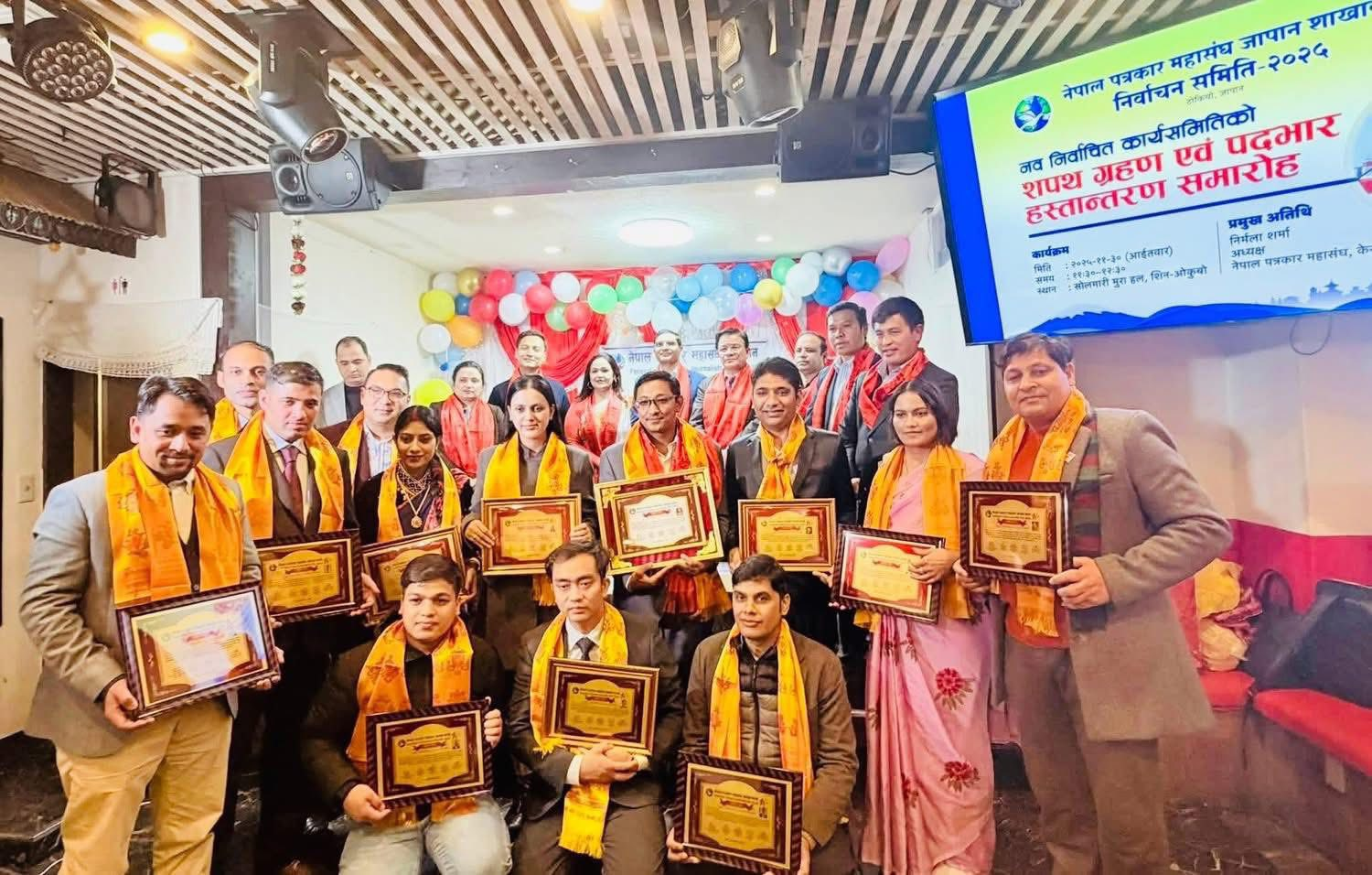 नेपाल पत्रकार महासंघ जापान शाखाको छैटौं अधिवेशनबाट नवनिर्वाचित कार्यसमितिको शपथग्रहण तथा पदभार हस्तान्तरण कार्यक्रम सम्पन्न भएको छ ।